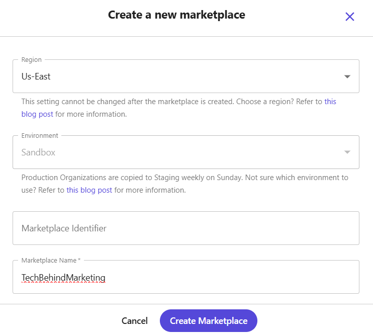 If we have a specific region to create it, we select it; otherwise, we can leave the default region and simply enter the name before clicking Create Marketplace.