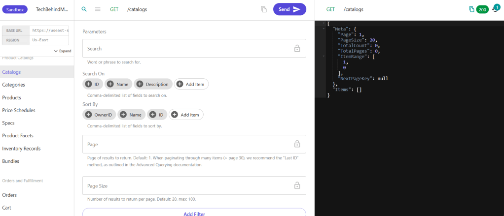 Within the OrderCloud portal, you can create all these entities easily. Select the entity from the left panel, and on the right panel, you’ll find all the available endpoints. You can start using them right away by simply clicking Send. Of course, everything will be empty at first.